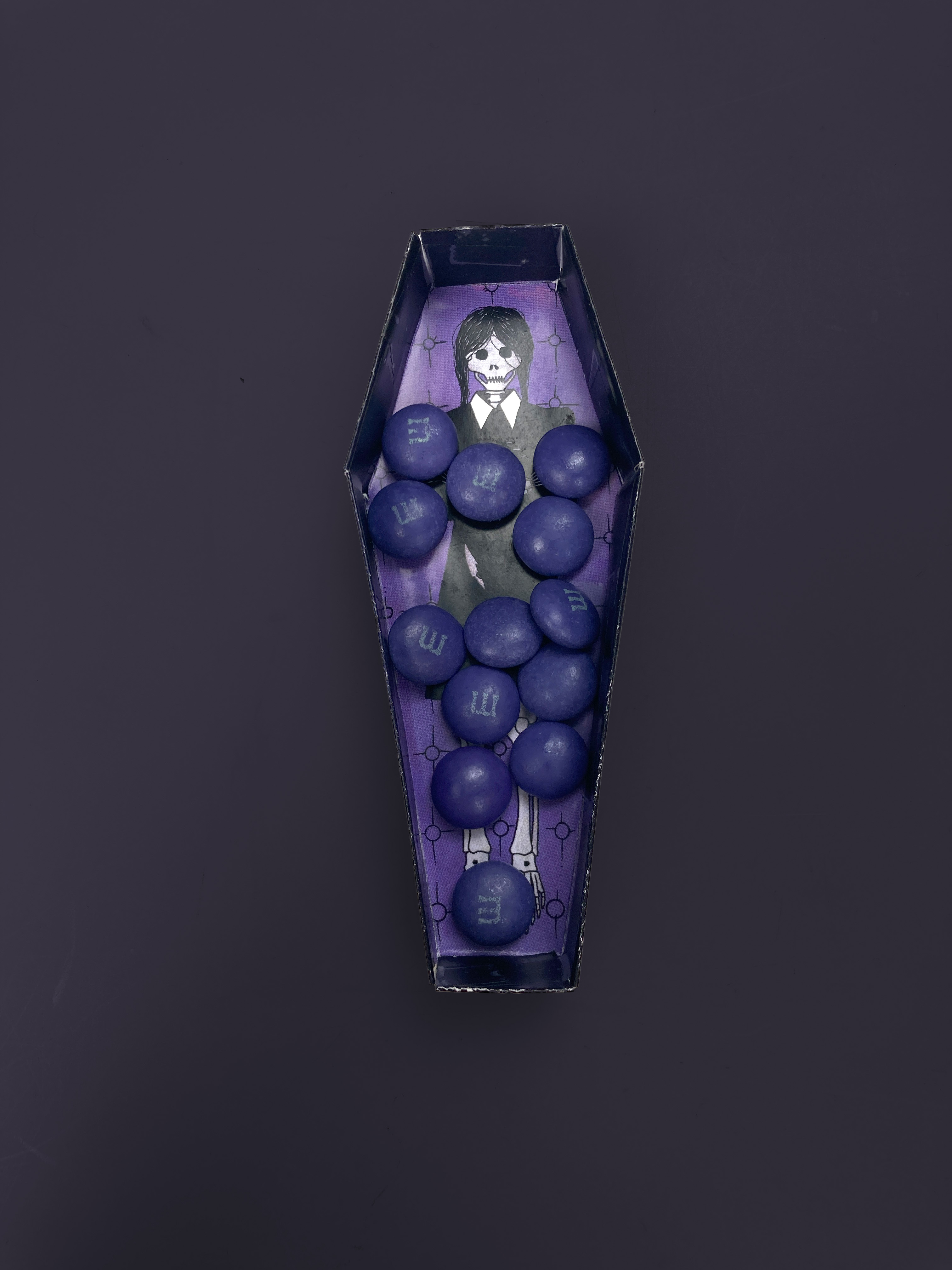 A (fictional) special edition purple M&M’s release promoting the release of Tim Burton’s Addams Family spin-off, “Wednesday.”